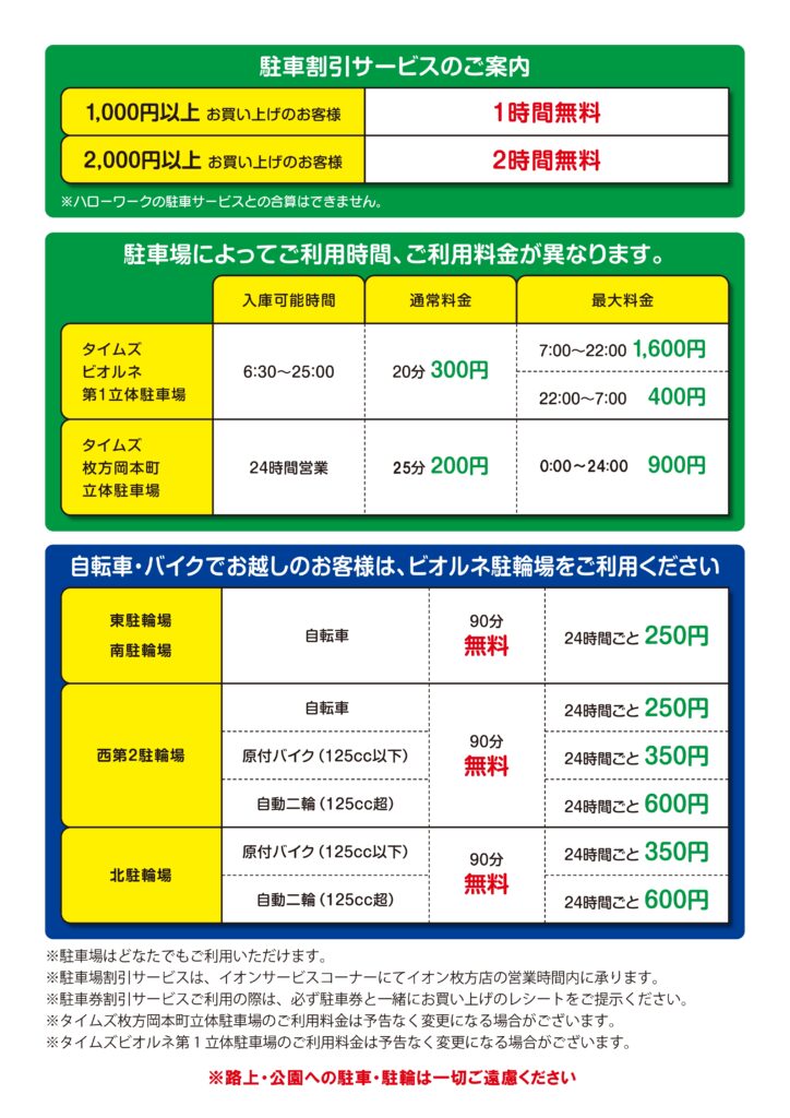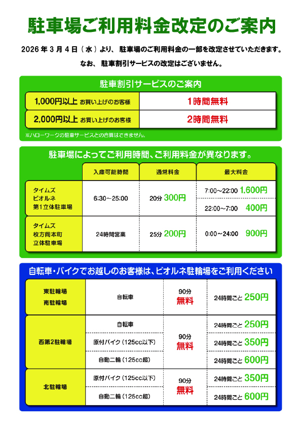 2026年3月4日(水)よりタイムズ枚方岡本町立体駐車場の料金が変わります。